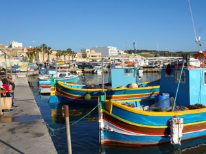 | 南東部の漁港の一つ、マルサシュロク(Marsaxlokk)。伝統的なマルタカラーの小型漁船が多数停泊する湾で、日曜日の魚市場が有名な、シーフードの町です。 | ディングリ(Dingli)の断崖は、青い海が雄大に広がる、マルタで最もパノラミックな所。海からすぐのディングリ村は、海抜253メートルで、マルタの最高所です。 | |