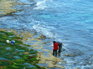 | マルタ島西端にある、ゴールデン・ベイ(Golden Bay)。白い砂浜があり、夏は海水浴場として賑わいます。 | 海藻を採る漁師(左の緑の部分)の姿も見える、素朴な猟師町の風景。マルタの海岸はどこも水が綺麗です。 |