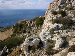 | マルタの海岸の自然美を代表する場所としては、南のブルー・グロット(Blue Grotto)が有名。海中の洞窟は、大戦中は避難場所としても使われたそうです。今は漁船に乗って見物ができます。 | ブルー・グロットからさらに北西へ行った、アー・ラプシ(Ghar Lapsi)の海岸線は、険しい岩場ガ続きます。このあたり、観光ルートから一歩はずれると、道なき道を行くことにもなりますので注意。 | |