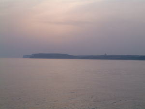 海もやや荒れ模様の日。夕方になって、雲がわずかばかり切れてくれ、どんよりした海を一瞬輝かせてくれました。 | もう二度と現れないのではないかというような沈み方をした太陽。でも恐らく翌日の天候回復を示唆しているのでしょう。 |
