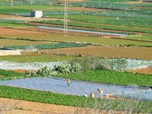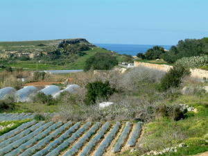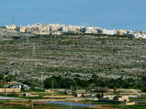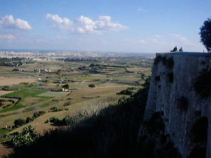 ゴールデン・ベイ(Golden Bay)への道すがら、しばし畑作地帯を通過します。水の便が悪いので、やはり大規模農業にはほど遠く、手作業で畑仕事をする姿は、一見長閑ですが・・・ | 要塞の古都、イムディーナ(Mdina)は内陸の高台にあり、眺めは見事。周囲は平坦な農村地帯が広がり、遠くに街が、その向こうに海も見えてしまい、小さい島国であることを再認識。 | |