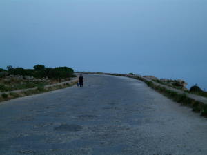 モスタに近い、郊外内陸部の町、ナッシャー(Naxxar)。見るものとて特にない普通の住宅地で、スーパーがあり、銀行があり、観光客の姿もなく、マルタ市民のごく日常の姿が見られます。 | 日没後もしばらくの間、明るさの残る初夏のディングリ(Dingli)の海崖に沿った道。このあたりは人家も無い寂しい所ですが、近くの住宅の人なのか、犬を連れて散歩している人がいました。 |