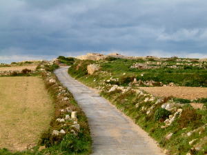 ヨハネパウロ2世も訪問したことのある、タ・ピーヌ・バジリカ(Ta'Pinu Basilica)の教会。町からはずれた野原の中に忽然と建つその姿はとても魅力的。 | あまりに何もない、車一台やっと通れるぐらいの狭い農道。実際、車も滅多に来ません。こんな所をのんびりと散歩できるのも、ゴゾの田舎の魅力でしょう。 | |