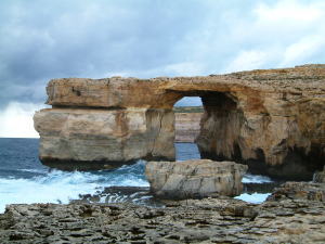 ゴゾ島南東部のアラ(Qala)の海岸近くの高台。このあたりからは、左手前間近にコミノ島、その右に無人島のコミノット、そして奥にマルタ本島が見渡せます。 | ゴゾ島最西端の観光名所だった、アズールウインドウ(Azure Window)という岩。残念ながら年々侵食が進み、2017年についに崩壊してしまい、今は見られません。 | |