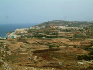 ゴゾ島南西部、比較的良く知られた海辺のリゾート地、シュレンディ(Xlendi)。ホテルやレストランも一通り揃っています。荒れ模様の冬の日とあって、町もひっそりしていました。 | 赤茶けた大地がそこかしこに広がるゴゾの田舎。海はどこにいても見えます。海辺を中心に時に中層ビルが見られるものの、まだまだ広々とした土地が沢山残っています。 | |