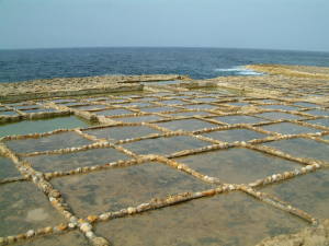 マルタは夏の半年間、殆ど雨が降りません。だからこそ、天然の海から塩を採取する伝統的な塩田が、今なお健在です。場所は北部、マルサルフォーン(Marsalforn)の西。 | 小さな島、ゴゾ。どこにいても、海が近くにあります。イムジャール(Mgarr)港とヴィクトリア(Victoria)の間の国道上、ヘリポート付近からの夕方の海の眺め。 |