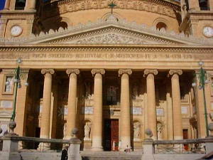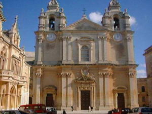 中世にタイムスリップしたような、城壁に囲まれたイムディーナ(Mdina)。車の乗り入れもないため、人の少ないシーズンオフに訪れると、本当に現代でないかのような錯覚に。 | 古都イムディーナのセント・ポール大聖堂。マルタにおけるバロック美術の粋が集まった、著名な、マルタ有数の見ごたえのある教会です。現在のものは、1702年に完成しました。 | |